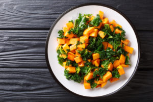 Ingredients 2 Tbsp extra virgin olive oil 1 teaspoon fresh ginger, minced 1 cup sweet potato, peeled and finely diced 1/8 teaspoon ground cinnamon ¼ cup water 3 cups cleaned, stemmed, and chopped dinosaur kale, in bite-sized pieces ¼ teaspoon sea salt 2 Tbsp golden raisins ¼ teaspoon maple syrup 2 Tbsp ground pecans, for…