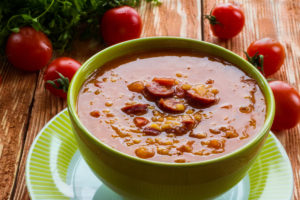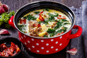 Ingredients 6 slices uncured bacon, cut into 1-inch pieces 1 lb. sweet or spicy Italian sausage Crushed red pepper, to taste 1 medium yellow onion, diced 5 cloves garlic, minced 6-8 medium red potatoes, cut into ½-inch cubes Sea salt and pepper, to taste 4 cups organic chicken bone broth 5 cups kale, chopped 1…
