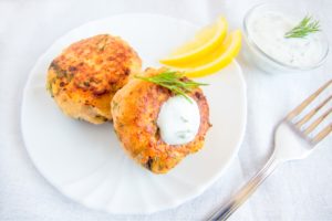 Ingredients 1 lb. fresh salmon 2 Tbsp. avocado oil 1 medium onion, diced 3 cloves garlic, minced Ghee or avocado oil for sautéing and frying ¼ cup + 2 Tbsp. blanched almond flour 1 teaspoon seafood seasoning like Primal Palate 3 Tbsp. Paleo mayo, either homemade or store-bought 2 teaspoon coconut aminos 1 Tbsp. Dijon mustard…