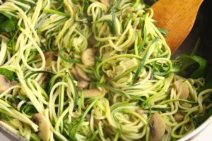 Ingredients 4 pork sausages, sliced 4 zucchinis, spiralized 1 onion, sliced 1 bell pepper, sliced ½ cup mushrooms, sliced 2 garlic cloves, minced 1 cup chicken stock ½ cup coconut milk 2 Tbsp. fresh parsley, minced 2 Tbsp. coconut oil Sea salt and freshly ground black pepper Instructions 1. Heat the coconut oil in…