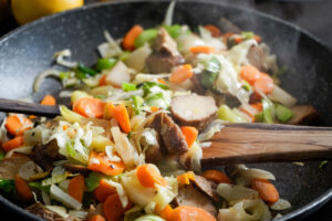 Ingredients 2 Tbsp coconut oil 2 Tbsp sesame oil 1 large cabbage, sliced 1 large onion, sliced 1 cup chopped carrots, about 3-4 medium-sized 1 inch ginger, grated 3 cloves garlic, grated or diced ¼ cup coconut aminos 1 ½ lbs. ground pork or chicken Instructions 1. Add coconut and sesame oil to a…
